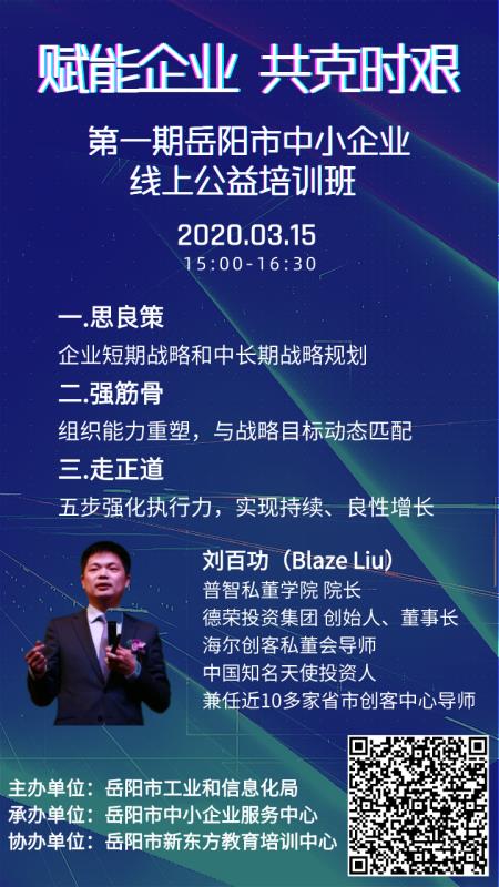 为了助理企业防疫防控、复工复产“两手抓”“两手硬”,进一步提升中小企业经营管理水平,提高企业家应对新形势新挑战的能力,由岳阳市工业和信息化局主办、岳阳市中小企业承办、岳阳市新东方教育培训中心协办的“赋能企业 共克时艰”第一期中小企业线上公益培训班,将于3月15日面向全市企业负责人开展免费线上直播培训。