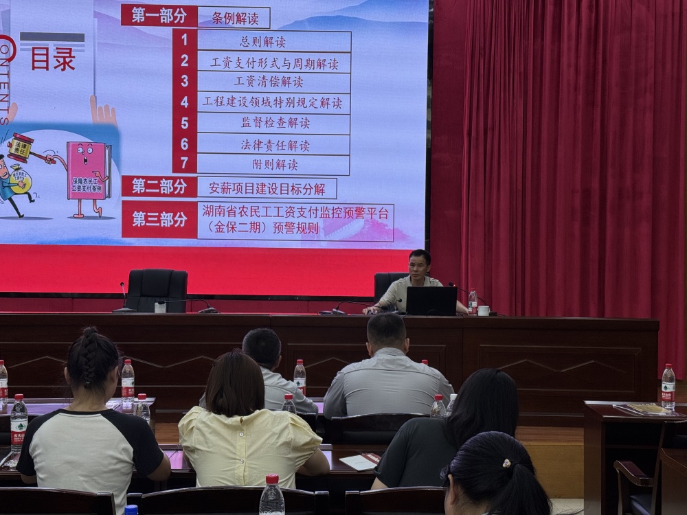 2025年7月29日云溪区劳动人事争议仲裁院组织在建项目负责人及劳资员参加云溪区关于农民工工资清缴相关培训;作为项目建设的“掌舵人”,大家每天都奋战在工程一线,既要把控进度、质量,也要兼顾安全、协调各方,可以说肩上的担子不轻。这次培训,特意围绕在建项目中最核心的难点——农民工工资支付相关问题,两网一体化系统操作问题来开展;并邀请了资深专家岳阳市劳动争议仲裁院根治欠薪中心王三亮主任来分享经验。王主任通过条例解读、安薪项目建设目标分解、湖南省农民工工资支付监控预警平台(金保二期)预警规则这三部分内容为学员们带来了精彩的讲解和分享,希望通过交流,能帮大家解决实际工作中的困惑,也给各位提供一个互相学习、取长补短的平台。
