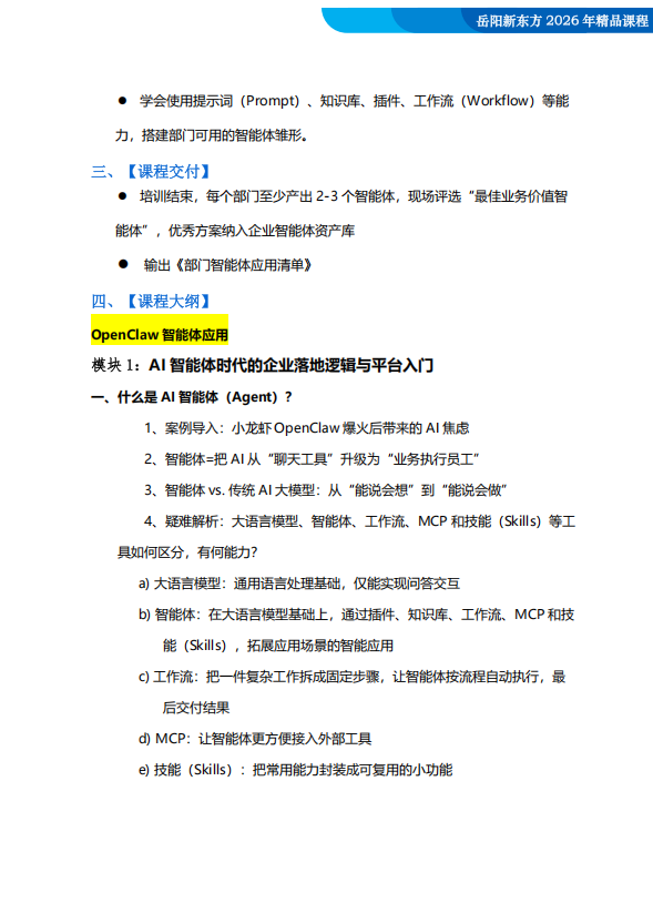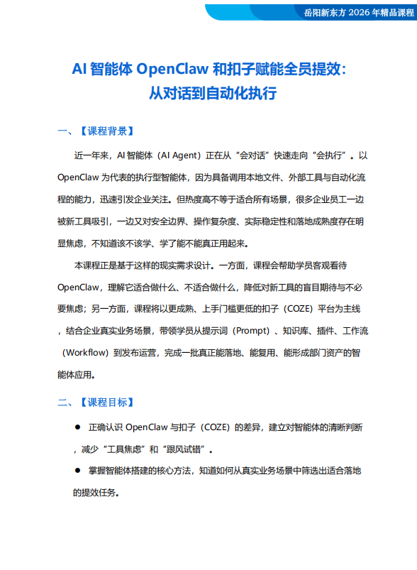 新东方管理咨询当前您所在的位置:首页 > 【课程通知】AI智能体OpenClaw和扣子赋能全员提效: 从对话到自动化执行